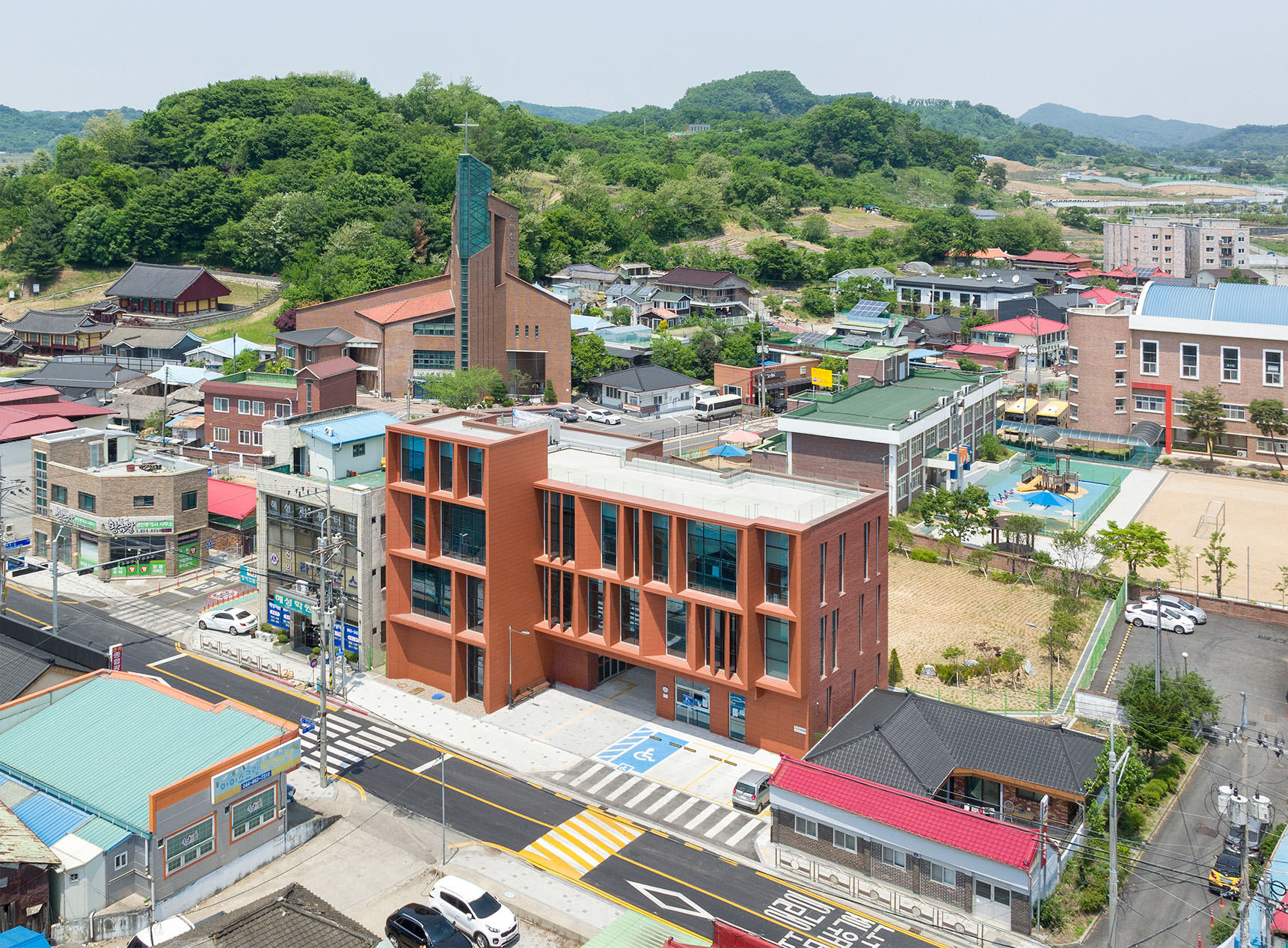 짙은 붉음이 담긴 벽돌은 마을의 기억을 품고,