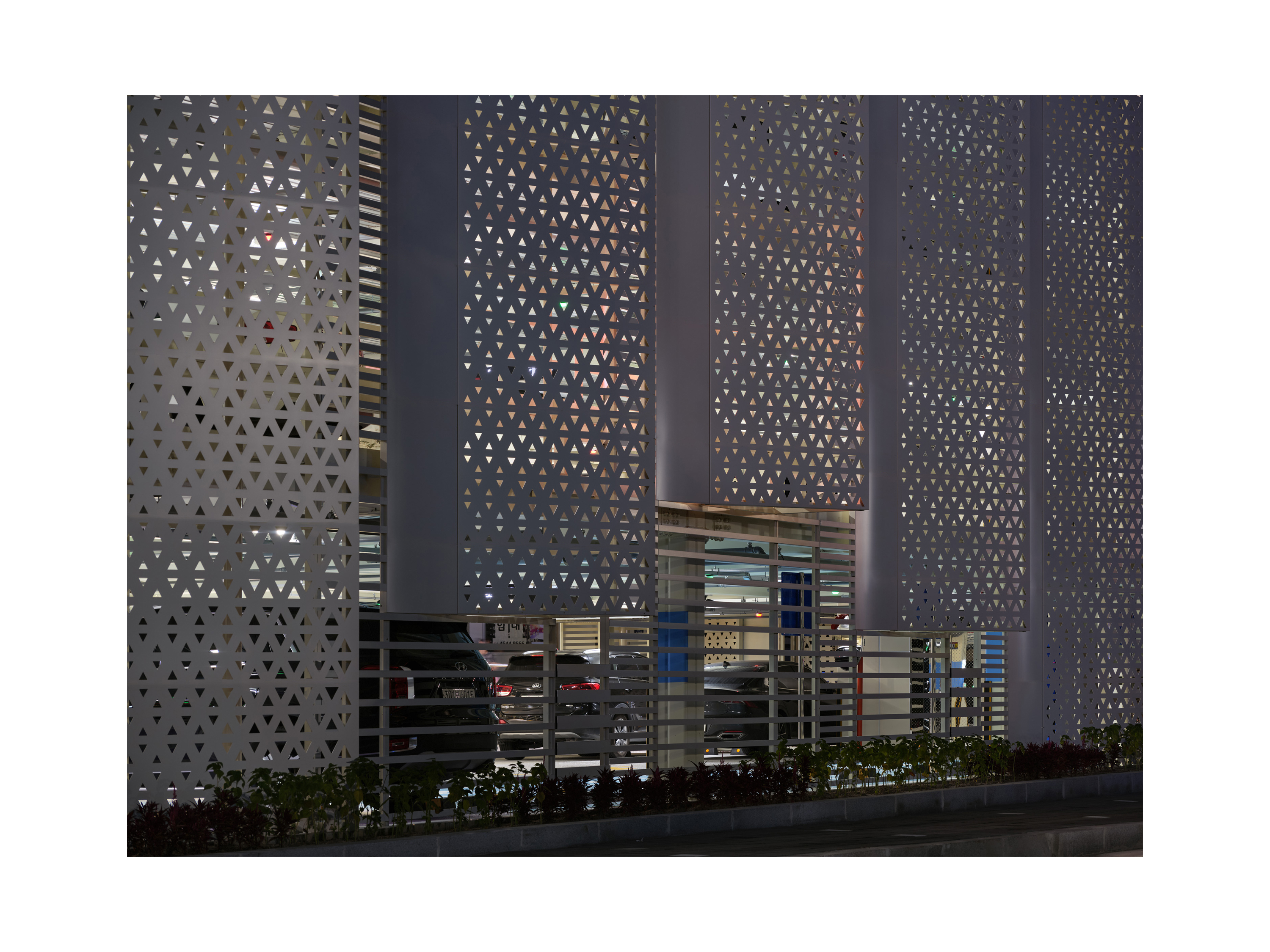 이중 입면은 타공 알루미늄 패널과 사선 루버로 구성되어, 공기와 빛을 조율하며 시간에 따라 그림자와 리듬이 흐르는 감각의 장을 형성합니다.